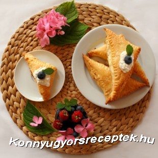 Egyszerűen kitekerjük a friss leveles tésztát és a hosszabbik oldalánál félbe vágjuk. Ezt követően félbe hajtjuk és háromszögeket vágunk. Összesen 16 db háromszöget kapunk, amiből 8 db süti lesz. A háromszögeket megtöltjük a túrós krémmel úgy, hogy a széleknél maradjon fél centi üres tészta. Az üres részt megkenjük vizes ecsettel, így könnyen ráragad az üres háromszög. Végül villával megnyomkodjuk a szélét, hogy ne tudjon kifolyni a töltelék és megkenjük a háromszögek tetejét vizes ecsettel. Előmelegített sütőben, 200 fokon 15-20 perc alatt elkészül.