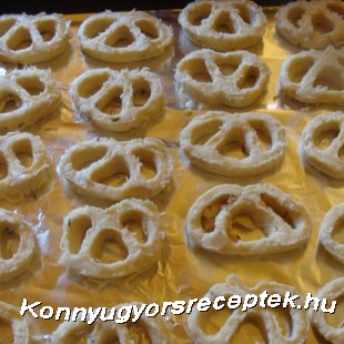 Lisztezett perecformával kiszaggatjuk,fóliával bélelt tepsire tesszük, és megsütjük.
