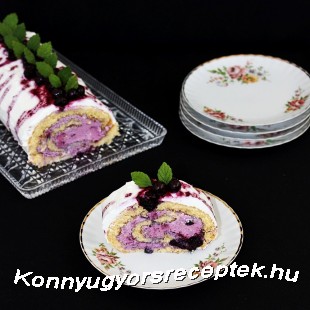 Ezután vonjuk be a tekercset a félretett fehér krémmel, majd ízlés szerint díszítsük áfonyával.