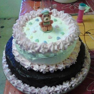 A tojásfehérjéket felverjük. A sárgákhoz hozzáadjuk a cukrot, a vaníliás cukrot és felverjük. Hozzáadjuk a sütőporral, kakaóval elkevert lisztet, összekeverjük. Ehhez adjuk a habot a tojásfehérjékből, amit szép lassan beleforgatunk. Ezt beletesszük kis (azaz 16 cm-es formába) sütőpapírra, szúrópróbáig sütjük. Addig összekeverjük a krémet. A fehér csokit gőz fölött megolvasztjuk, langyosra kihűtjük, majd hozzákeverjük a mascarponé-hoz. A tejszínt felverjük a habfixálóval és óvatosan a többihez adjuk. A piskótát ketté vágjuk, az alját visszatesszük a formába, majd jó sok krémet kenünk rá, de hagyjunk a díszítéshez is. Rátesszük a másik piskótát, betesszük a hűtőbe dermedni. Kivesszük a tortát, és kinyújtjuk a marcipán masszát, annyira hogy a tetejét elfedje. Ekkor kivesszük az alsó tortát, két hurkapálcikát teszünk középre, hogy megtartsa a tetejét. Ráhelyezzük a kis tortát, amit bevonunk a maradék mascarpone krémmel, amibe belekeverjük az ételszínezéket. Díszítésnek a mascarpone krémből nyomunk rá torta díszítővel.