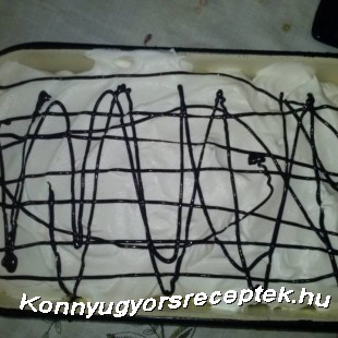 Rásimítjuk a piskótára, majd miután kihűlt rákarikázzuk a banánt. A tejszínt a habfixálóval keményre felverjük, majd a süteményre simítjuk. Csokisziruppal meglocsoljuk, majd hűtőbe tesszük.