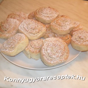 A hozzávalókat simára dolgozzuk, egy kicsit pihentetjük a hűtőben. Téglalap alakúra nyújtjuk, megkenjük vékonyan olajjal, megszórjuk cukros kakaóval ( dióval) feltekerjük, ujjnyi széles csíkokra vágjuk, és sütőpapírral bélelt tepsire téve 180 C fokos sütőben, kb. 25 perc alatt szép rózsaszínűre sütjük. Porcukorral szórva tálaljuk.