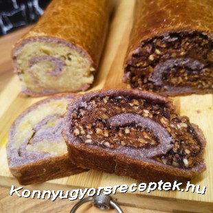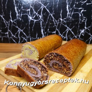 5. A tésztákat folpackra tesszük, 20x25 cm-re nyújtjuk és megkenjük egyiket mogyorós, a másikat marcipános krémmel úgy, hogy 3 szélén 2-2 cm üres helyet hagyjunk, a másikon pedig ujjpercnyit, azt hajtjuk majd az aljára. Behajtjuk a tészta két szélét az üres helyeken a krém irányába, ezek lesznek az oldalai, majd szépen a folpack végét húzva felcsavarjuk a bejglinket.