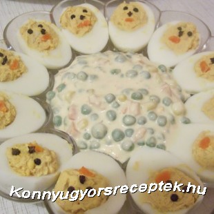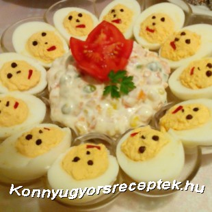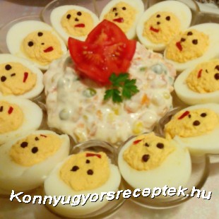 Utána tálra rendezzük a főtt-tojásos pipiket, s középre pedig a franciasalátát.