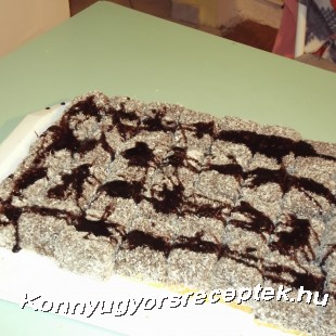 Miután a piskóta megsült, kihűlt, kockákra vágjuk, beleforgatjuk a meleg csokimázba, majd egyenként a kókuszreszelékbe.
