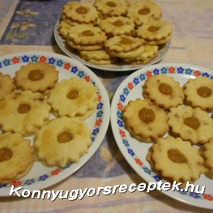 Még melegen (de nem forrón) baracklekvárral megkenjük az egész korongokat, s a lyukas korongokat pedig egyesével rárakosgatjuk a lekváros korongokra.