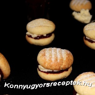 Tegyünk a keksz közepére egy mokkáskanál dzsemet, majd a dzsemre egy mokkáskanál vajkrémet. Ezután helyezzünk rá egy másik kekszet, és óvatosan kicsit nyomjuk össze. (így járjunk el az össze keksszel)
