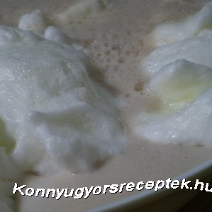 A tojást a cukorral, a szegfű-szeggel, a narancsaromával sóval habosra verjük robotgéppel, amíg a térfogata meg nem nő. Belecsorgatjuk előbb az olajat, majd a vizet. Kézi habverővel óvatosan elvegyítjük a sütőporos liszttel.