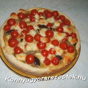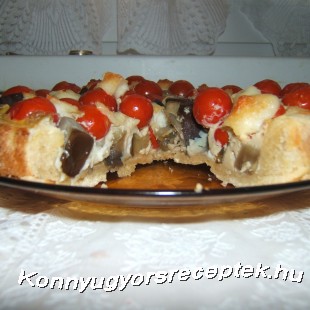 A töltelékhez a padlizsánt megtisztítjuk, meghámozzuk, és kevés olajon megpirítjuk. Apróra vágott hagymát teszünk hozzá és azt is üvegesre pirítjuk. Sózzuk, borsozzuk. Mikor félig megpuhult a padlizsán a tésztát kinyújtjuk, és kivajazott sütőformába nyomkodjuk, majd rákanalazzuk a padlizsánt. Ezután egy felvert tojást a reszelt sajttal ráöntjük a padlizsánra és a koktélparadicsomokat rászórjuk a tetejére és közepes lángon készre sütjük.