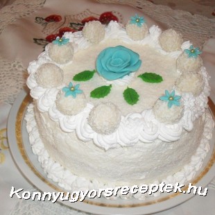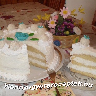 A krémhez 1 dcl tejszínt melegítünk, beletördeljük a csokit, simára keverjük, kihűtjük. A zselatint 1/2 dcl vízben megduzzasztjuk, melegítjük, majd hűtjük. A mascarponét kikeverjük a cukorral, hozzáadjuk a csokis tejszínt, a zselatint, a kókuszreszeléket, majd a maradék 2 dcl keményre felvert tejszínhabot. A tortalapot 3 lappba vágjuk, betöltjük a lapokat, kívülről is megkenjük, és megszórjuk kókuszreszelékkel. Alkalomhoz illően dekoráljuk.