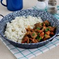 A húst megmossuk és felvágjuk kockákra. A hagymát tisztítsuk meg, majd vágjuk azt is apró darabokra.