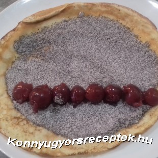 A palacsintára 2 evőkanál mákot egyenletesen elosztjuk a szélre kirakjuk a meggyet feltekerjük.