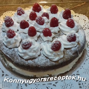 A tortát kihűlt ketté vágjuk ráhalmozzuk a krémet elsimítjuk a tetejét kirakjuk málnával belenyomkodjuk a krémbe.