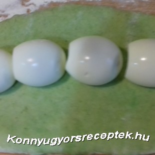 Ha megkelt akkor lazán át gyúrjuk ,pihentetjük majd téglalap alakúra kinyújtjuk a szélire rakjuk a megtisztított keményre főtt tojásokat feltekerjük a két végét lezárjuk.