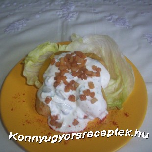 A salátalevéllel megágyaztam a burgonyáknak, majd nyakon öntöttem őket a tejfölös masszával és ennek a tetejére szórtam a szalonna darabkákat és egy pici őrölt pirospaprikával próbáltam még étvágygerjesztőbbé tenni.