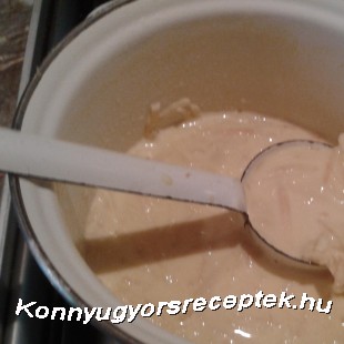 A a tojást kikavarjuk a cukorral a sóval,felváltva belekeverjük a tejet,a sütőporos lisztet,simára keverjük egy habverővel,végezetül hozzá ötjük az ásvány vizet ,ezzel is összekeverjük.
