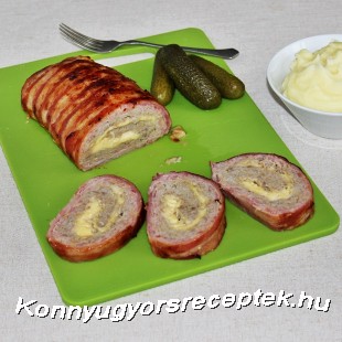 Egy nagyobb darab folpack fóliát terítsünk el az asztalon, majd kb. egy cm vastagságúra lapogassuk el rajta a húsmasszát, majd közvetlenül a húsmassza egyik végénél fektessük le a bacon szeleteket. (a bacon szeletek kicsit fedjék egymást, hogy feltekerésnél teljesen befedje a húsmasszát)