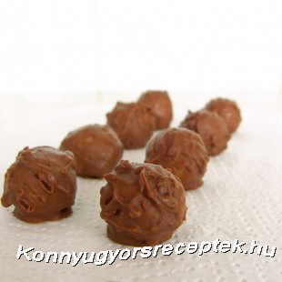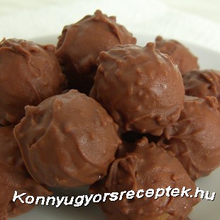 Gömböket formázunk belőle és kész is!(Ha nagyon ragadós a massza tegyünk hozzá annyi darált kekszet, hogy ne ragadjon formáláskor a kezünkre) A golyókat olvasztott csokiba mártjuk villával és rácsra vagy zsírpapírra tesszük míg rákeményedik.