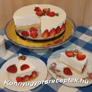 Tálalás előtt friss eper díszítjük ,forró vízbe mártott késsel szeleteljük.