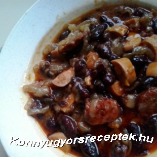 A 2 fej hagymát összevágjuk és az olajban félig megpirítjuk, majd hozzáadjuk a karikára vágott száraz kolbászt és átsütjük 2-3 percig. Amikor megpirult hozzáadjuk a felkarikázott virslit. Ezután hozzáadjuk a 2 doboz konzervbabot és a megadott fűszereket. Összerottyan az egész és tálaljuk.