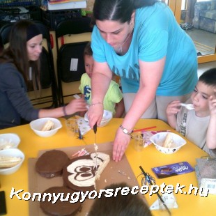 Összetöltöm a fejet és a két fület. Olvasztot csokival megrajzolom a vonalakat, ahol a fehér rész kezdődik a fejen, a füleket pedig teljesen bevonom csokival. A fehér részeket lekenem a maradék citromos krémmel, majd olvasztott csokival a csoki fóliájára megrajzolom a szemeket és a szájat, majd 10 perc fagyó.