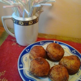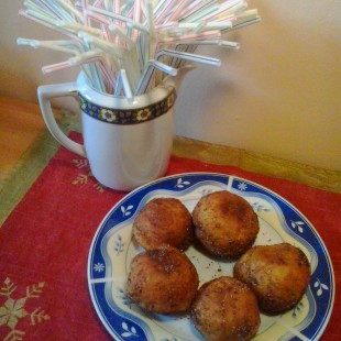 a meleg tejben felfuttatott élesztőt ekkor összekavarjuk, majd hozzáadjuk a megolvasztott vajat. Hólyagosra dagasztjuk, és konyharuhával letakarva meleg helyen legalább a duplájára kelesztjük. A megkelt tésztát lisztezett gyúrótáblára borítjuk, fél cm vastagra kinyújtjuk és egy közepes fánk szaggatóval tészta korongot szaggatunk. A kiszaggatott korongokat labda alakúra formáljuk a kezünkkel. Végül a forró olajban az első oldalukat letakarva , majd a fedő nélkül a másik oldalukat is pirosra sütjük. Ha megsült papírszalvétával bélelt tányérra szedjük és még melegen a cukrozott kakaóporba forgatjuk egyessével.