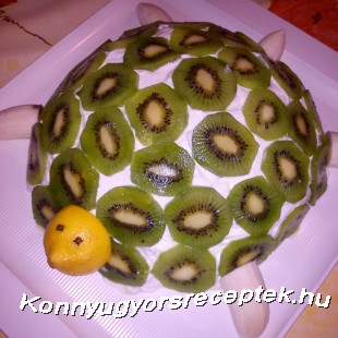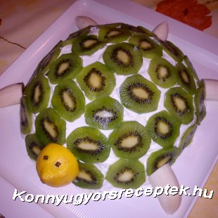 Tetejét a citromos krémmel zárjuk, majd kivi szeletekkel beborítjuk. A banánból elkészítjük a teknős lábait illetve farkincáját, a citrom feléből és a szegfűszegből pedig a fejét. 2 órára hűtőszekrénybe tesszük, amíg a piskóta megpuhul.