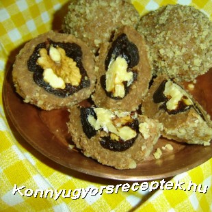 4. Vegyünk egy kanálnyit a kihűlt masszából és az aszalt szilvás diókat fedjük be vele. A gombóckákat hempergessük meg darált dióba.