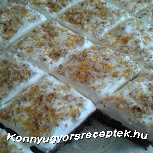 A cukrot az ásványvízbe keverjük. Addig kevergetjük, amíg a cukor teljesen felolvad. A lisztet, a sütőport és a diót összekeverjük, és a cukros vízhez adjuk, jól kikavarjuk. 22 x 35 cm-es sütőpapírral bélelt tepsibe öntjük a tésztát, 160 fokos sütőben nagyjából 25 perc alatt megsütjük. A megsült tésztát még melegen tálcára borítjuk, a sütőpapírt eltávolítjuk róla. Mikor kihűlt, villával megszurkáljuk a tésztát, és belocsoljuk. A habot felverjük, hozzáadjuk a cukrot, majd a tetejére simítjuk. A dióval és a narancshéjjal megszórjuk, hűtőbe tesszük, majd kínáljuk.
