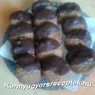 A hozzávalókat (a csoki kivételével) összegyúrjuk, amíg össze nem áll a tészta. Egy tepsibe sütőpapírt teszünk, kis gombócokat formázunk a tésztából, melyeket ellapítunk a tenyerünkkel, majd tepsibe sorakoztatjuk egymástól kicsit távol. 170 fokra előmelegített sütőbe toljuk kb. 12 percre, s világosra sütjük. Közben megolvasztjuk a csokoládét, a kihűlt kekszeket félig megmártjuk a csokiban, s rácson megszárítjuk.