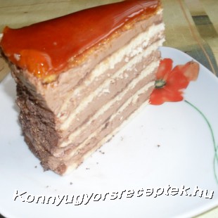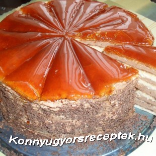 második lépes: A margarint nagyon habosra keverjük és cukorsziruppal, kakaóval,rumaromával ízesítjük. 5 lapot megtöltünk krémmel,de valamennyit hagyunk hogy körbe tudjuk kenni. A 6-k lapra ráöntjük a megolvasztott cukrot. Zsírba mártott kés fokával egyenlően elosztjuk,el is vághatjuk.Rárakjuk a torta tetejére. Körbe kenjük és csokireszelékkel,vagy csokidarával megszórjuk az oldalát.