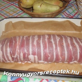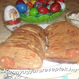 A zsemlét vízben megáztatjuk, jól kinyomkodjuk. A kétféle hagymát apró kockára vágjuk, kis zsiradékon megdinszteljük. A darált húst megfűszerezzük, hozzáadjuk a kinyomkodott zsemlét, a kihűlt hagymát , a tojást , a kis kockára vágott paprikát és sajtot. Alufóliára terítjük a fele húst, ráfektetjük a kolbászt, beborítjuk a többi hússal, hengert formálunk. A bacon szalonnával beborítjuk. ( alul legyen, az összeillesztés). Kiolajozott tepsibe téve, beborítjuk alufóliával, és 220 C fokos sütőben kb. 50 perc alatt megsütjük. A fóliát levesszük, és szép pirosra sütjük. Tetszőleges körettel tálaljuk.