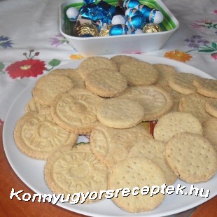 A hozzávalókból rugalmas tésztát gyúrunk. Kis ideig a hűtőben pihentetjük. 3 mm vastagságúra nyújtjuk, majd pogácsa kiszúróval kiszúrjuk. ( süti pecséttel mintákat nyomtathatunk rá).180 C fokos sütőben szép rózsaszínűre sütjük. ( kb. 20 perc)