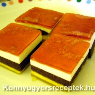 1,5 dl vízben 3 ek zselatint forrásig keverünk, majd hozzáadjuk a masszához. Tepsibe öntjük, hűtőbe tesszük, ha megdermedt, mehet rá a második réteg.