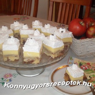 A krémhez a pudingport a kétféle cukorral sűrűre főzzük, majd hozzáadjuk a tojások keményre felvert habját, és óvatosan keverve még egy-két percig együtt főzzük. A tepsibe visszatett piskótára ( felül van az almás rész, ha kell tegyünk köré sütőkeretet ) még melegen öntjük. Kihűtjük. Ha kihűlt tetejére kerül a keményre felvert tejszínhab. Jó, ha egy éjszakát a hűben áll, másnap kockára szeletelve tálaljuk.
