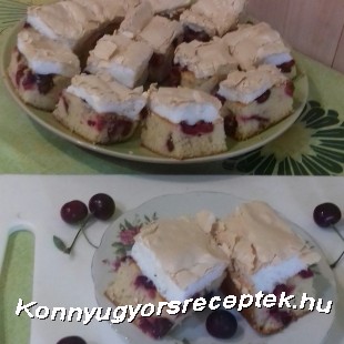 Veszünk egy 23X39 cm tepsit kikenjük olajjal, majd meg hímjük liszttel majd a tészta felet belesimítjuk a tepsibe. A magozott meggy felével megszórjuk. A maradék tésztát rásimítjuk végezetül rászórjuk a megmaradt magozott meggy másik felével.