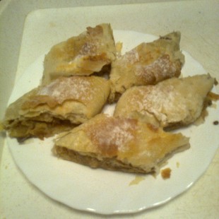 Almás töltelék: reszeljük le az almát, és dinszteljük meg. Ha kihűlt szórjuk meg a lapot grízzel, és tegyük rá az almát, ízlés szerint szórjuk meg fahéjjal, cukorral.