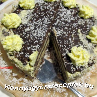 A félretett krémmel díszítjük, illetve az oldalát tetejét kókuszreszelékkel megszórjuk.