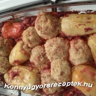 Miután készen van, ráöntjük a tálban lévő paprikára és a gombócokra. 180 fokon kb. 20 percig sütjük.