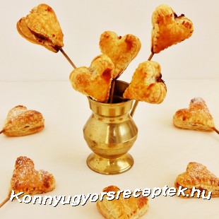 Az előnyújtott leveles tésztát szúrjuk ki szív alakú formával, majd ízlés szerint tegyünk a közepére lekvárt, vagy mogyorókrémet.