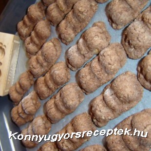 3.A kész tésztából kis darabokat csippentünk amit a jól kilisztezett formába nyomkodunk és sütőpapírral bélelt tepsibe kiütjük.