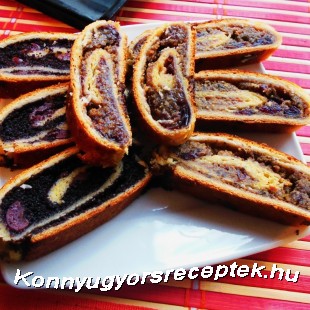 A mákot a cukorral ledaráljuk, a meggyet kiolvasztjuk. Összekeverjük őket, a meggylét is felhasználva. Így kapunk egy megfelelően lágy tölteléket. Amikor ezt elkenjük a tésztán, megszórjuk még meggybefőttel is. Érdemes a meggyet negyedelni, vagy még kisebbre vágni, sokkal jobban eloszlik a mákban!