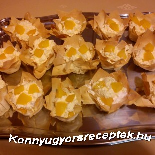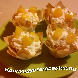 A mascarpone krémsajthoz hozzáadjuk a porcukrot, a vaníliás cukrot, és az Aranka krémport, majd jól elkeverjük. A tejszínt kemény habbá verjük, és fokozatosan adagolva a krémhez adjuk. Et követően a krémet a kosárkákba töltjük, és a darabokra vágott barackkal díszítjük.