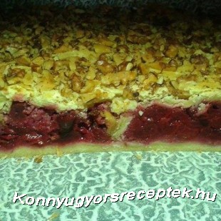 Másnap két darabra vágjuk. és az egyiket kinyújtjuk, kibélelünk vele egy közepes nagyságú tepsit. Meghintjük a darált dió vagy a zsemlemorzsa felével, és ráterítjük a megtisztított kimagozott meggyet.