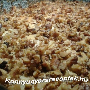 A cukrot rászórjuk, és a darált dió vagy zsemlemorzsa maradékával meghintjük. Befedjük a másik darab, szintén lappá nyújtott tésztával, és a tojásfehérjével megkenjük. Villával megszurkáljuk, és a durvára vágott dióval meghintjük.