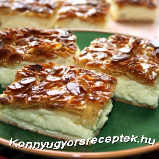 Még egyszer átgyúrjuk a tésztát, és kinyújtjuk a tepsin. Villával néhányszor megszurkáljuk. 15 percig kelni hagyjuk. Rákenjük a mandulás keveréket, és 30 perc alatt kisütjük.