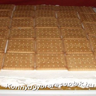 Ha kihűlt, egyenletesen rákenjük a piskótára, majd a tejszínt felverjük a habfix-el, rákenjük a narancsos krémre, és a tetejét kirakjuk a narancsos keksszel, és megkenjük olvasztott nutellával. Pár órára hűtőbe tesszük, fogyasztás előtt a kekszek mentén szeleteljük.