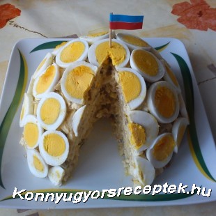A tojásokat keményre főzzük, és kihűtjük. A burgonyákat meghámozzuk, és delikátos vízben puhára főzzük. Az almát szintén meghámozzuk és a savanyú uborkával együtt vékony kis csíkokra vágjuk. A sertéshúst vékonyra szeleteljük, sózzuk, borsozzuk, lisztbe forgatjuk, és forró olajban ropogósra sütjük. A megfőtt burgonyát, a kihűtött sertéssültet, és négy darab főtt tojást a többi hozzávalóhoz hasonlóan csíkokra vágjuk. A saláta összetevőit egy tálba tesszük, és a majonézzel elkevert tejföllel jól átforgatjuk. Tálaláskor a salátát egy tányérra halmozzuk, és befedjük a maradék szeletelt főtt tojással. Jól lehűtjük, és egy tortához hasonlóan szeletenként tálaljuk.