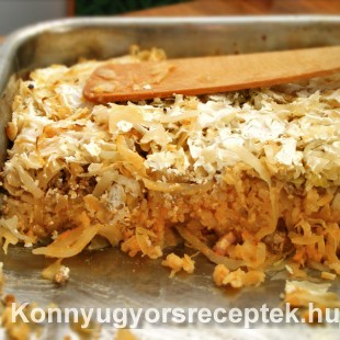 Erre rászórjuk a szalonna darabokat és a sült kolbász karikákat, majd beterítjük még egy réteg káposztával (1/4 rész káposzta). Ezután következik a rizs, amit egyenletesen elterítünk. A rizsrétegre következik a darálthús, majd erre a maradék káposztát terítjük szét. (A káposzta tetejére ráöntözhetjük a kisült szalonna maradék zsiradékát.) Végül a (kis tejjel hígított) tejfölt locsoljuk szét a tetején. Előmelegített 180 fokos sütőben kb. 30 perc alatt készre sütjük.