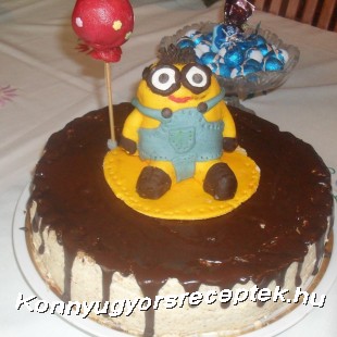 A piskótát 3 lapba vágtam , megtöltöttem a krémmel, az oldalát is. A tetejét én most olvasztott csokival öntöttem le , és gabona masszából készült, nyújtható cukormázzal bevont minyonnal díszítettem.